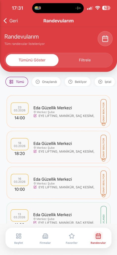 Hızlı ve Kolay Randevu: Takip ettiğiniz işletmelerin ve şubelerin müsaitlik durumlarını anlık olarak görün, dilediğiniz hizmet (cilt bakımı, lazer, makyaj, tırnak vb.) için randevu talebinizi hemen iletin.