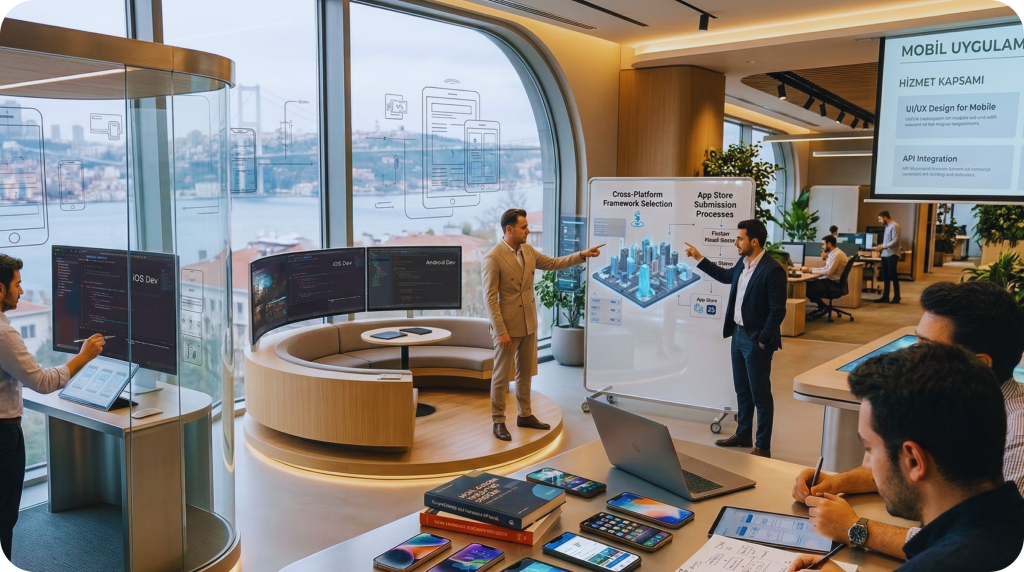 İşletmenize özel iOS ve Android mobil uygulama geliştirme hizmetleri sunuyoruz. Kullanıcı dostu arayüzler, yüksek performans ve güvenilir altyapı ile markanızı mobil dünyada öne çıkarıyoruz. Müşteri deneyimini artıran, ölçeklenebilir ve yenilikçi mobil uygulamalar geliştirerek işletmenizi her an erişilebilir hale getiriyoruz.